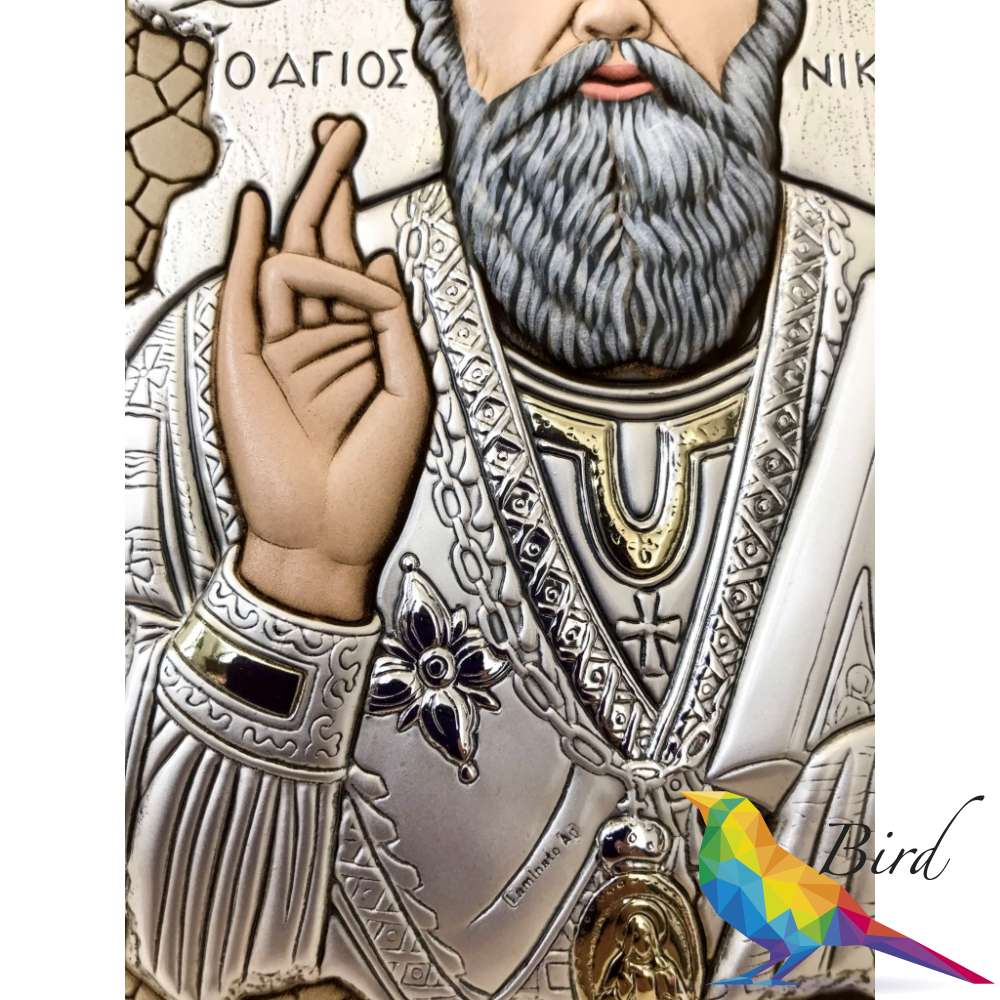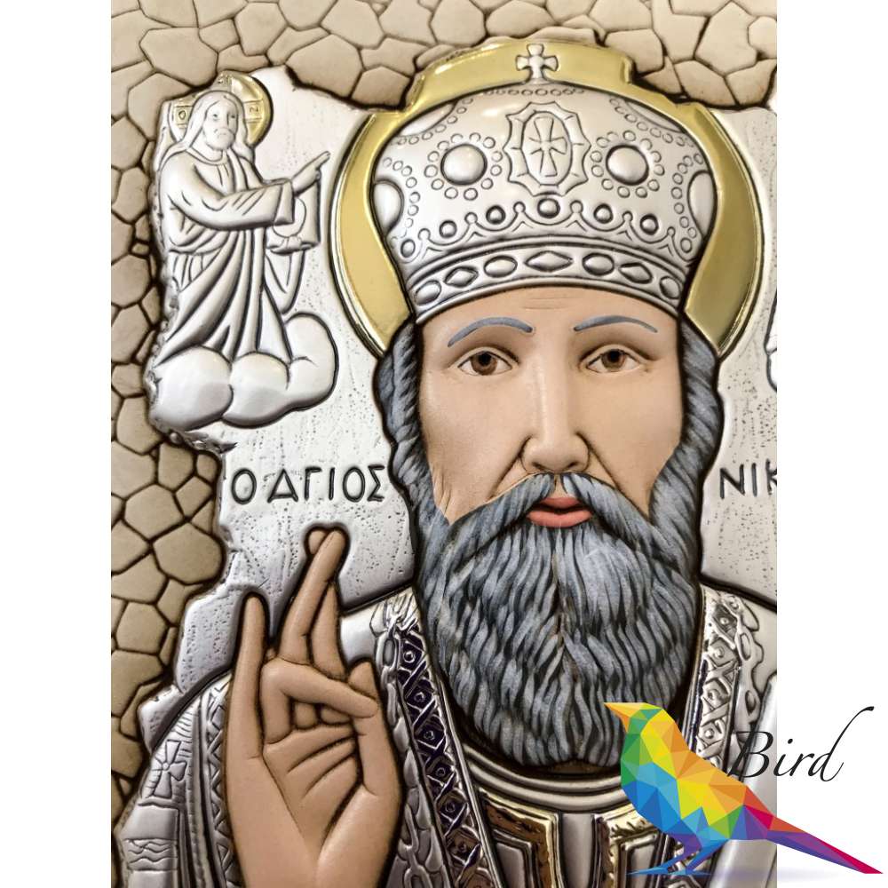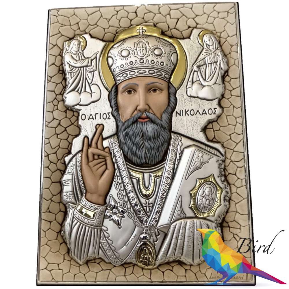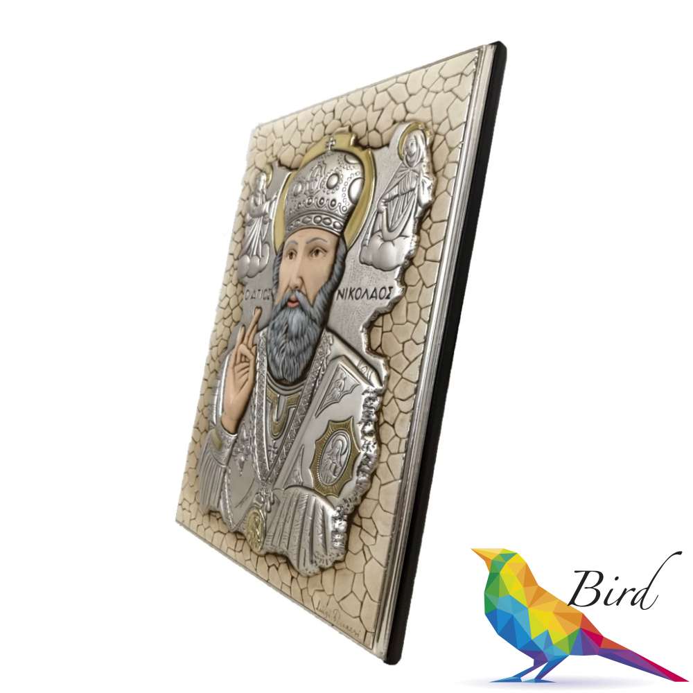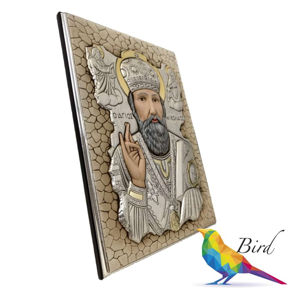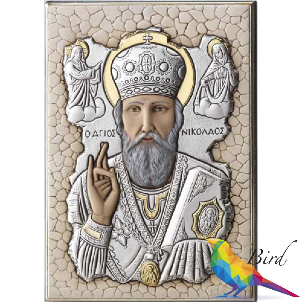 Cеребро 925 пробы также является основным материалом Иконы с изображением Николая Угодника, некоторые отдельные элементы композиции дополнены позолотой. Кроме того, изображение Святого Николая Угодника на данной иконе размещено на фоне мозаики, что дает больше вариантов для возможности размещения изделия в интерьере.